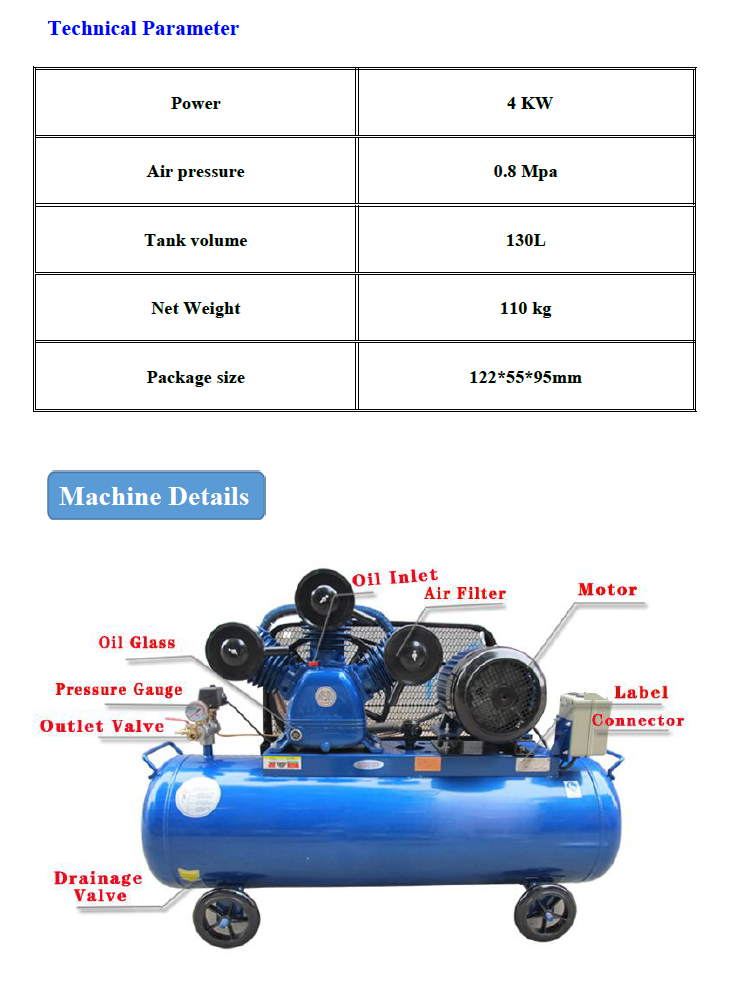 The dimensions of the 130L air compressor are approximately 130 cm x 60 cm x 80 cm, and it weighs around 100 kg.