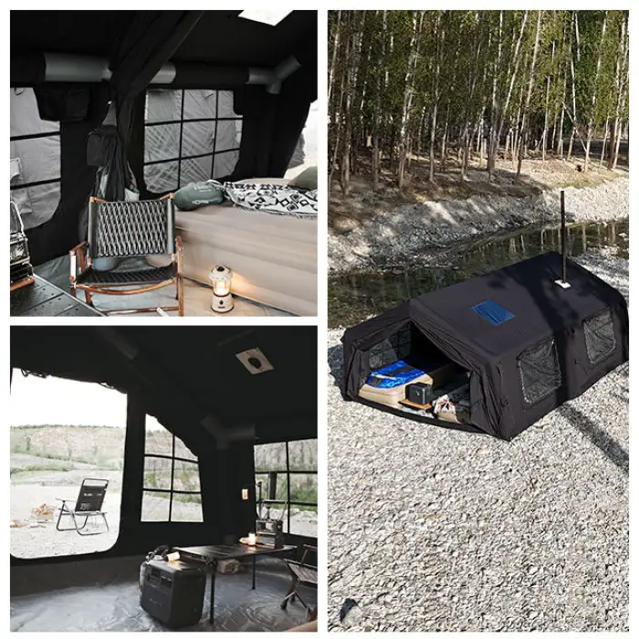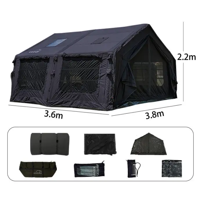 The tent features an easy setup process and comes with an included air pump for quick inflation.
