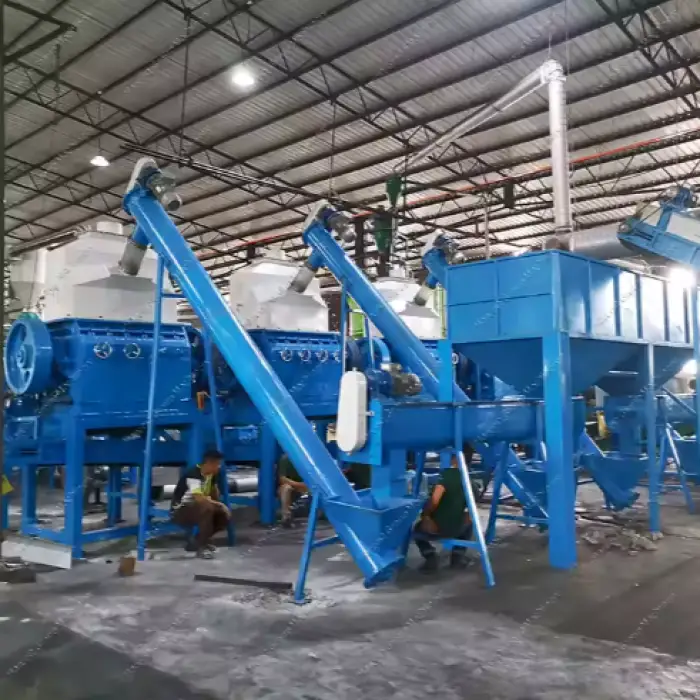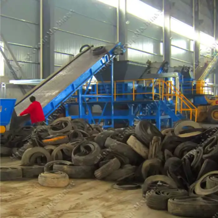 This tire recycling line can produce rubber blocks, rubber granules, and rubber powder from waste tires.