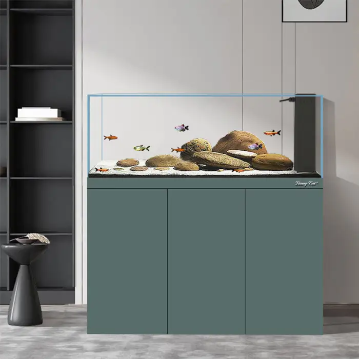 The fish tank has a modern rectangular shape that fits nicely in various living spaces.