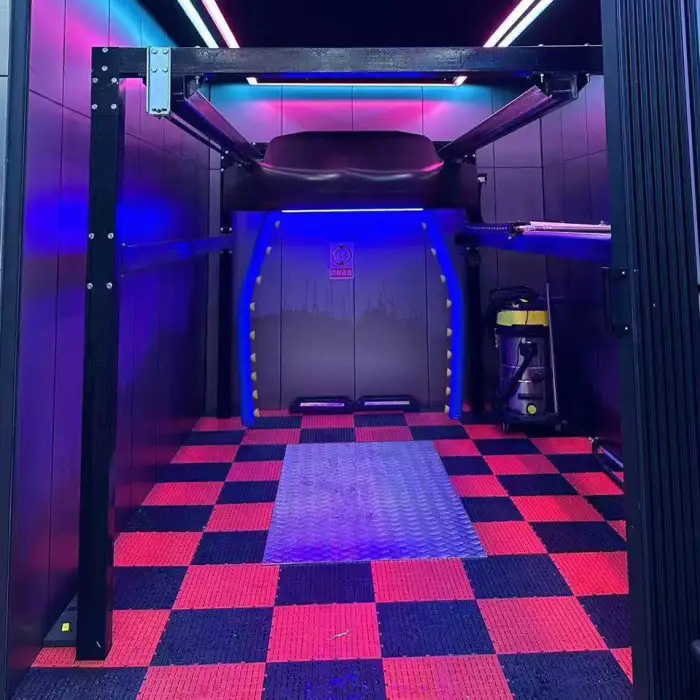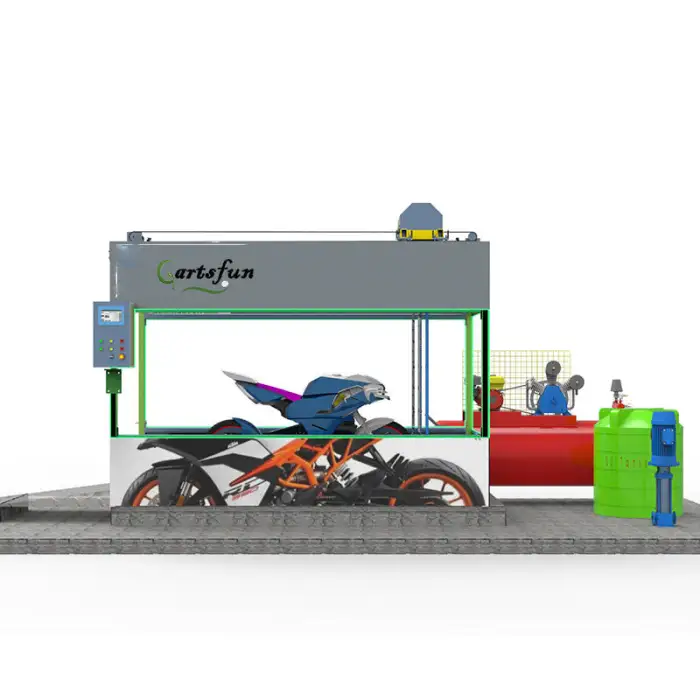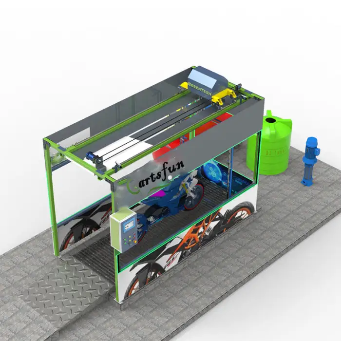 The touchless washing technology uses high-pressure water jets to clean the motorcycle without physical contact, ensuring a safe and thorough wash.