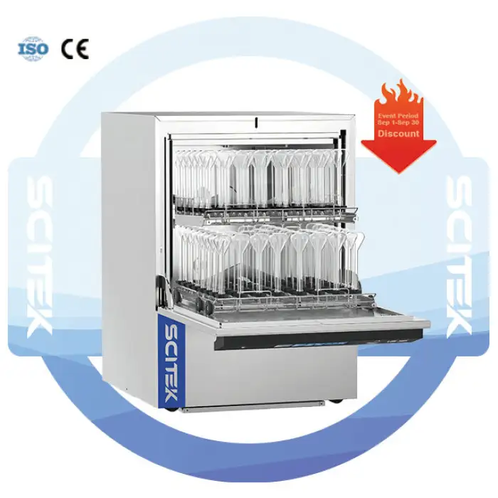The washer is designed for cleaning various laboratory glassware, making it suitable for research facilities, educational institutions, hospitals, clinics, and pharmaceutical companies.
