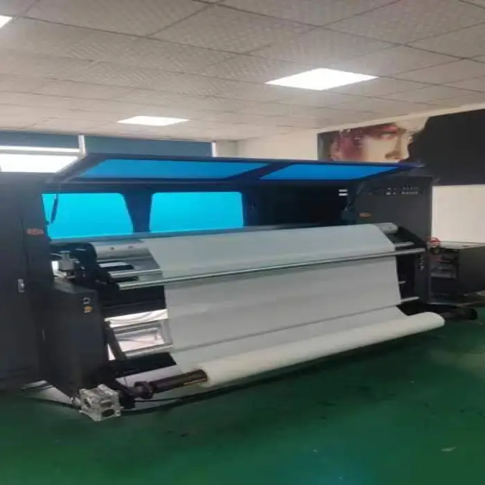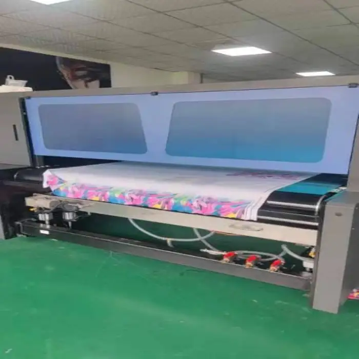 This machine uses sublimation ink for high-quality prints on various textile materials.
