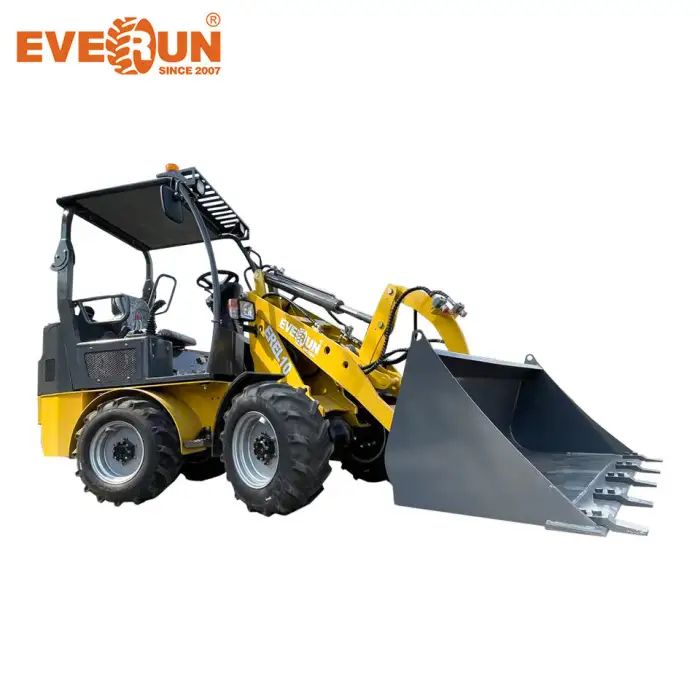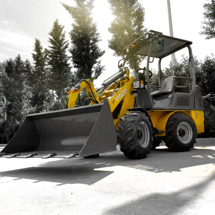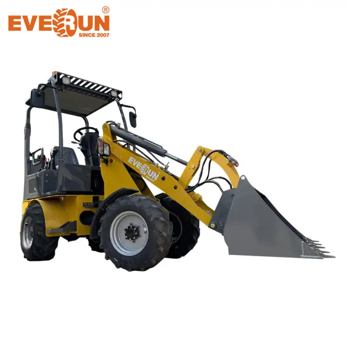 The 1-Ton Electric Mini Wheel Loader has a rated load capacity of 1000 kg.