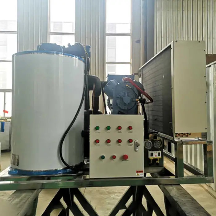 The machine produces flake ice efficiently at a rate of 1 ton per 24 hours.