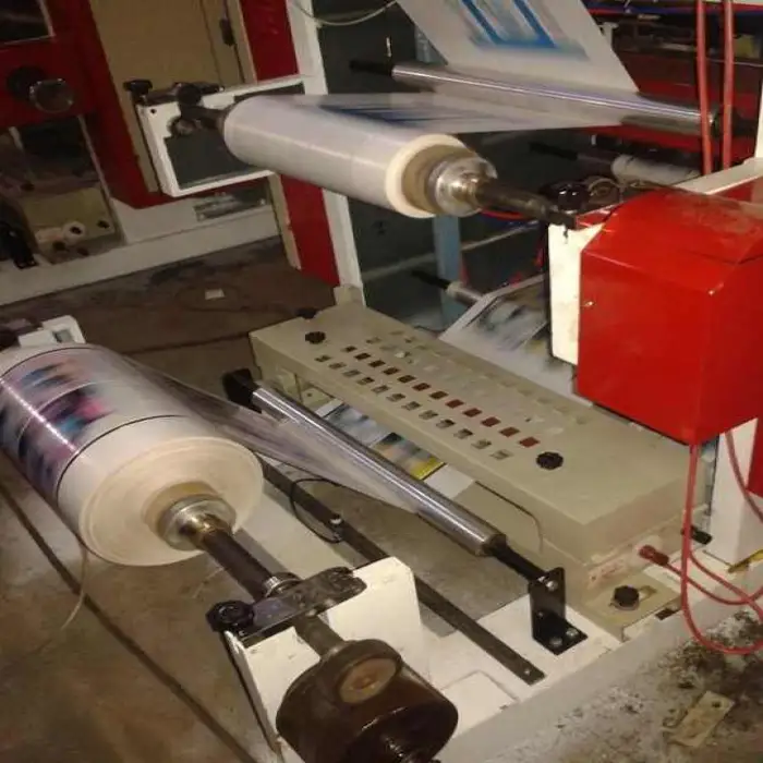 The machine uses letterpress-type plates suitable for flexographic printing setups.