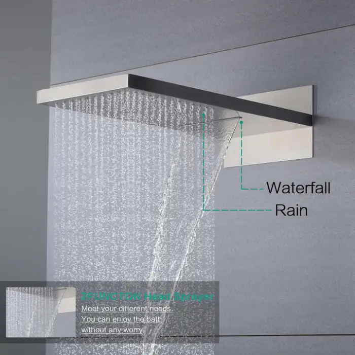 The showerhead is made of brass, with a stainless steel valve core for durability, and it has a brushed nickel surface finishing.