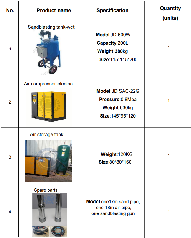 The package typically includes the 200L sandblasting tank, air compressor, air storage tank, and necessary hoses and fittings.
