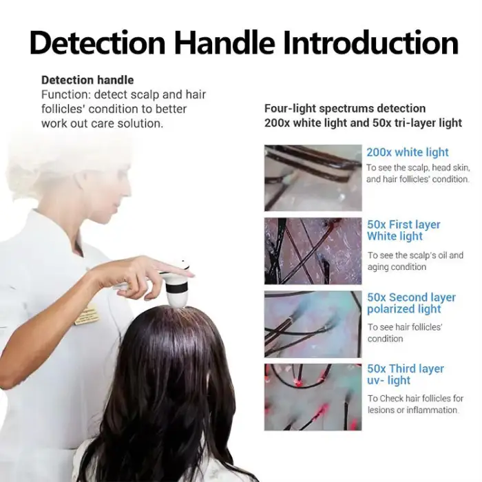 The device utilizes advanced magnifying lenses (50x and 200x) to provide detailed analysis of your scalp's health, helping you understand your scalp condition better.
