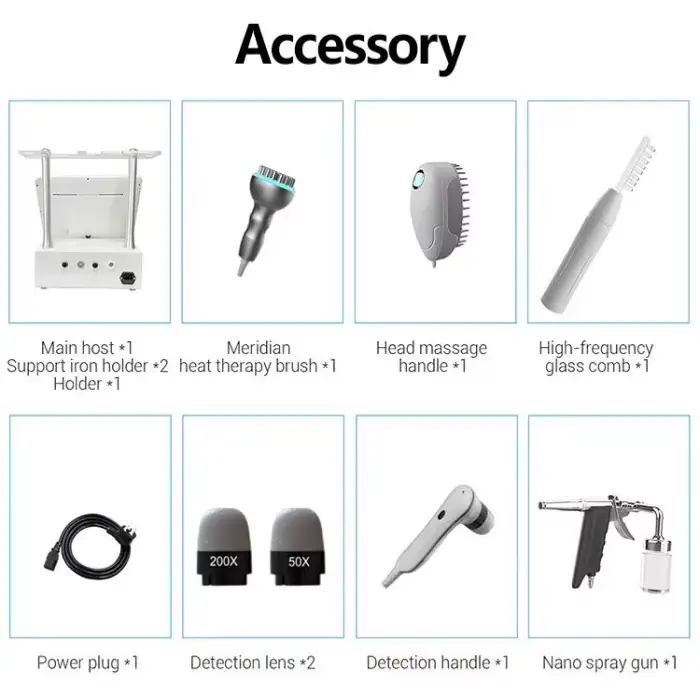 It features five multifunctional handles for various treatments, high-definition scalp analysis with 50x and 200x magnifying lenses, high-frequency treatment, a soothing nano spray for hydration, and silicone massage combs for a relaxing experience.