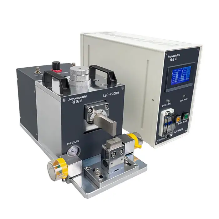 This machine performs ultrasonic welding, which is ideal for creating high-quality welds in various metal types.
