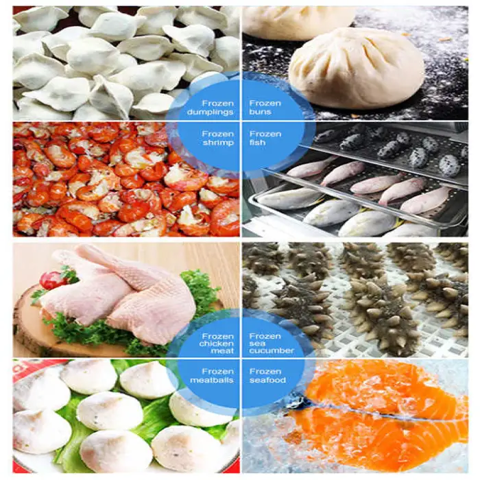 Freeze time varies by product thickness, load size and starting temperature. The unit is engineered for fast blast freezing; for exact cycle times refer to the included machinery test report and video inspection or request typical cycle data from the supplier.
