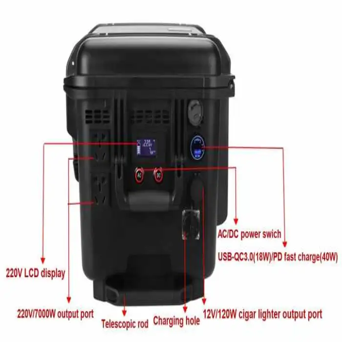 It includes a 220 V/7000 W AC output port, a 12 V cigar lighter output port, USB Quick Charge 3.0 and USB-C PD fast-charge ports. Exact number and layout of outlets can vary by configuration—check the product listing or manual.