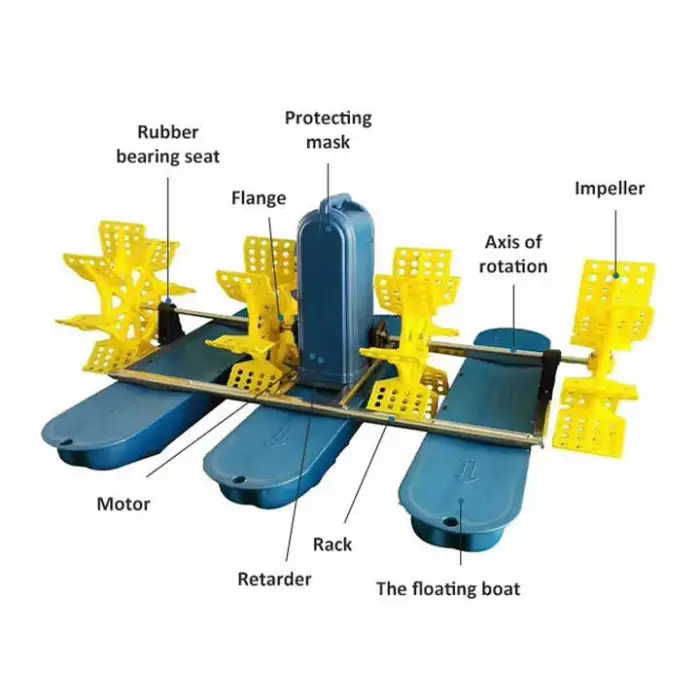 The Paddle Wheel Aerator is equipped with six impellers for efficient oxygen distribution.