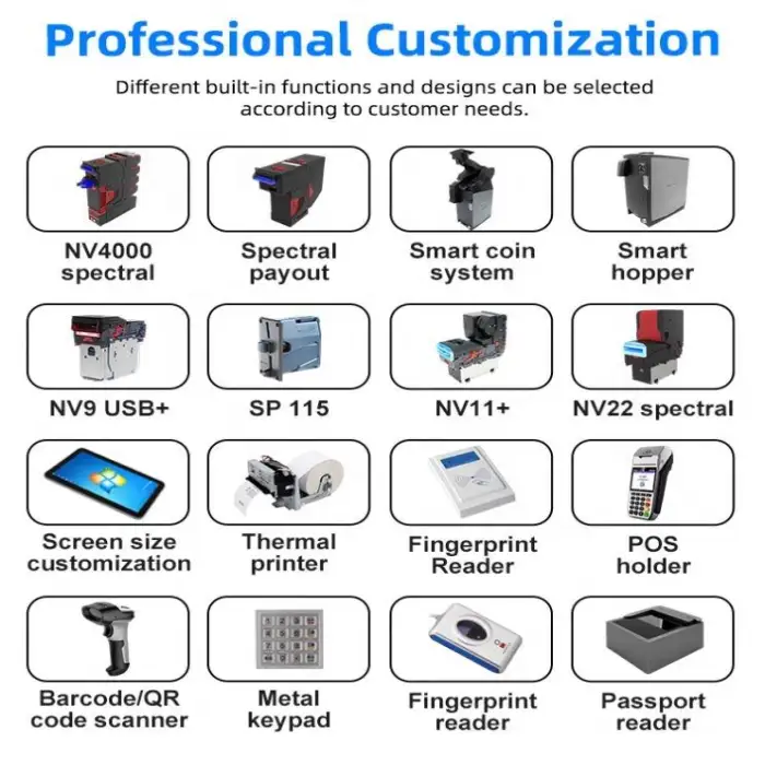 The self-order machine supports multiple operating systems, including Windows 7, Windows 10, Android, Ubuntu, and Linux.