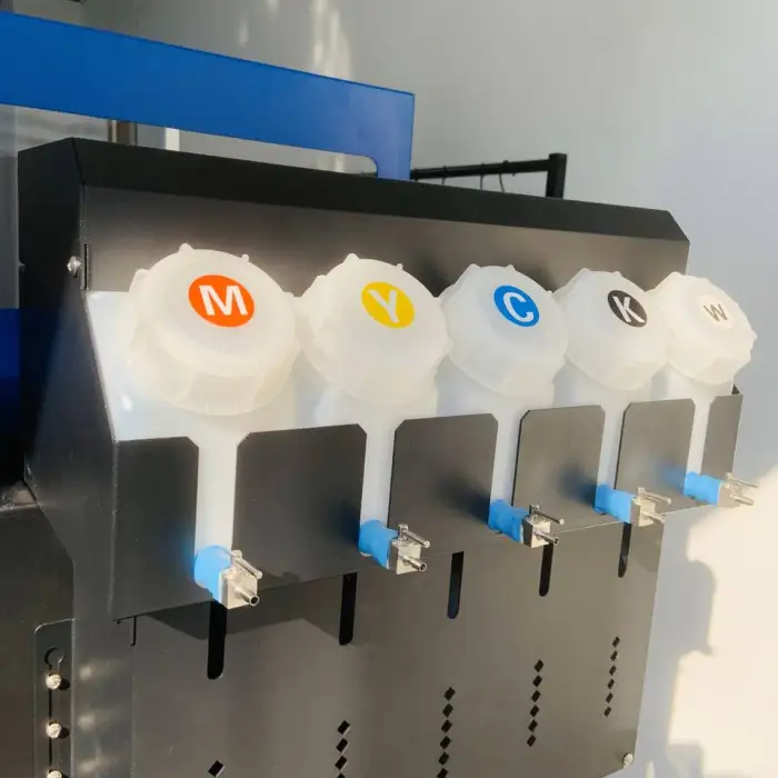 The printer uses pigment ink and textile ink, providing vibrant colors and high-quality prints.