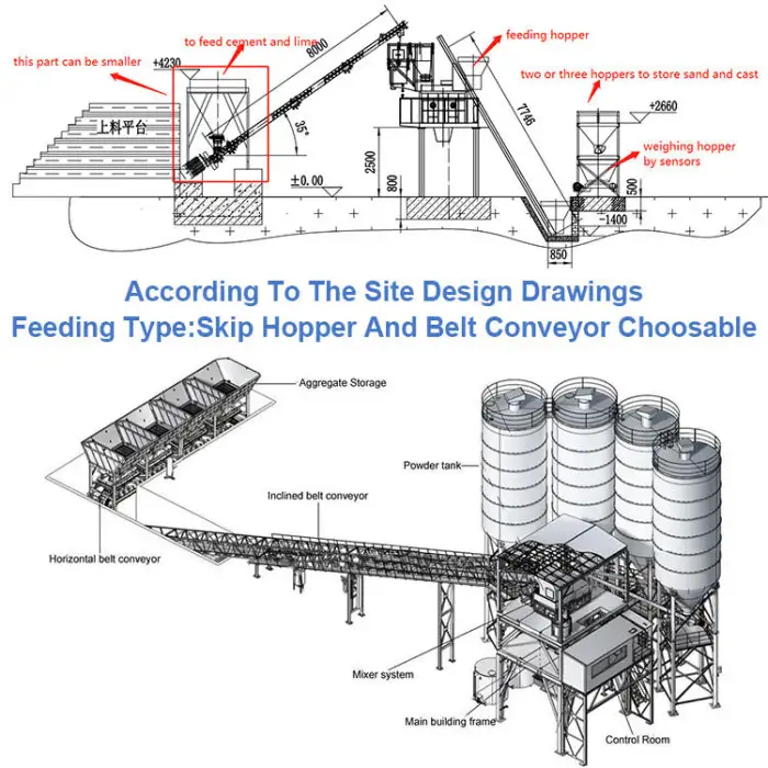 The batching plant can use either a screw conveyor or a belt for cement delivery, ensuring efficient material handling.