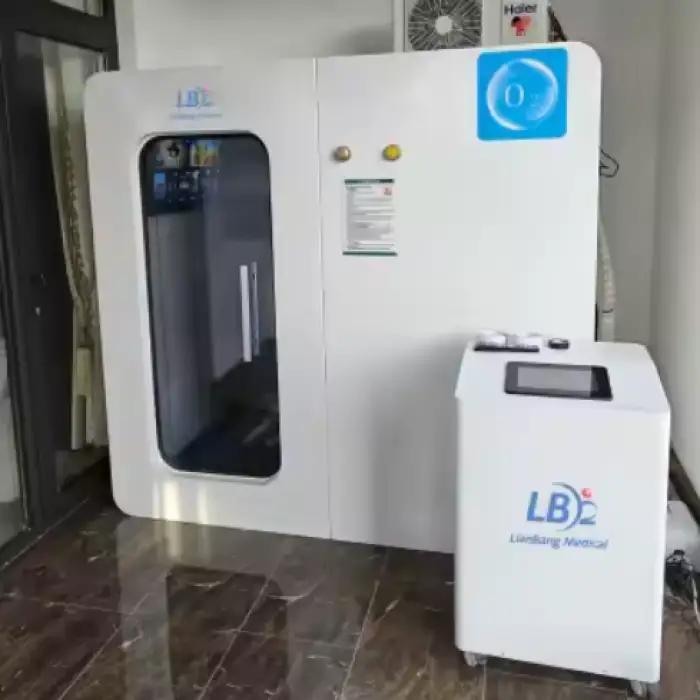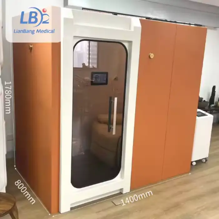 It is a hard-shell hyperbaric oxygen chamber (model LB1200-50) designed for rehabilitation and wellness use. The unit provides a controlled, oxygen-rich environment at therapeutic pressures (1.5–1.6 ATA) to support recovery, sports therapy, and wellness applications.