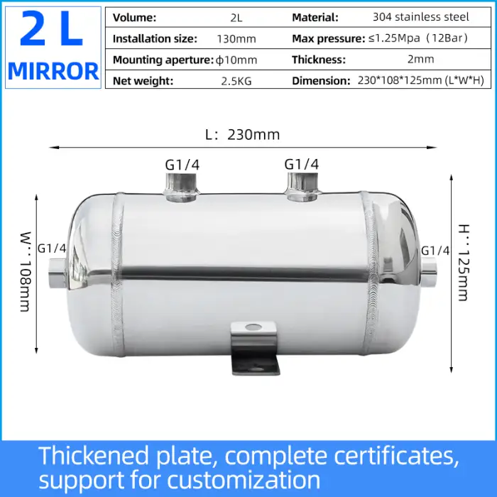 The 2L Horizontal Air Tank is made from high-quality stainless steel, ensuring durability and long-lasting performance.