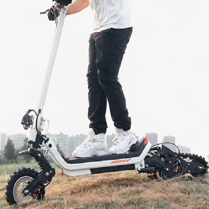 The scooter is equipped with 11" pneumatic street tires for a smooth ride.