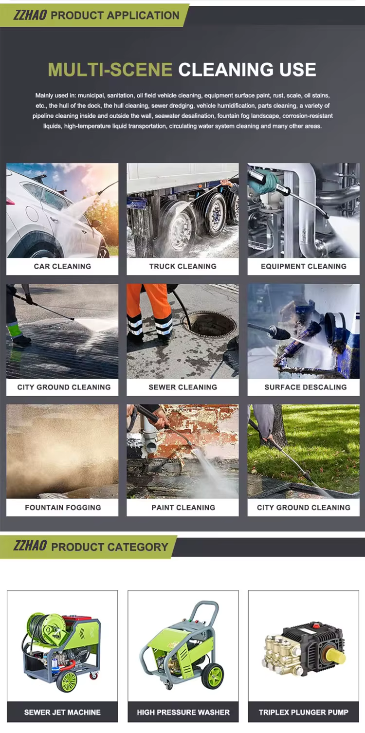 The machine is suitable for various applications including sewer cleaning, equipment cleaning, city ground cleaning, surface descaling, paint cleaning, and fountain fogging.