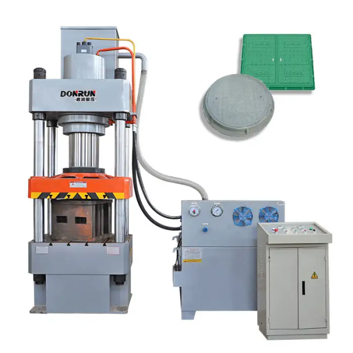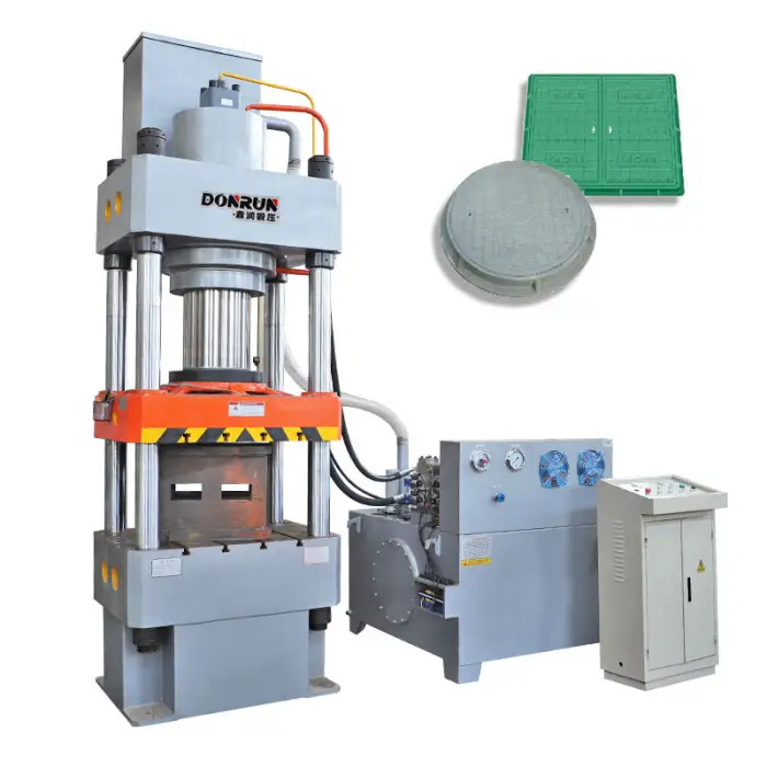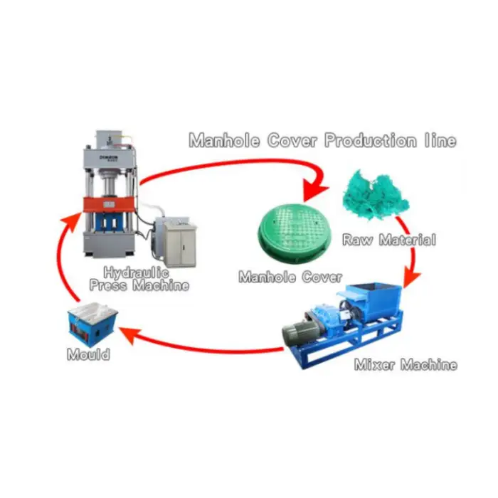 The machine is designed for making durable manhole covers using SMC (Sheet Molding Compound) and BMC (Bulk Molding Compound) resins.