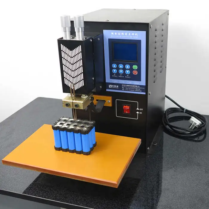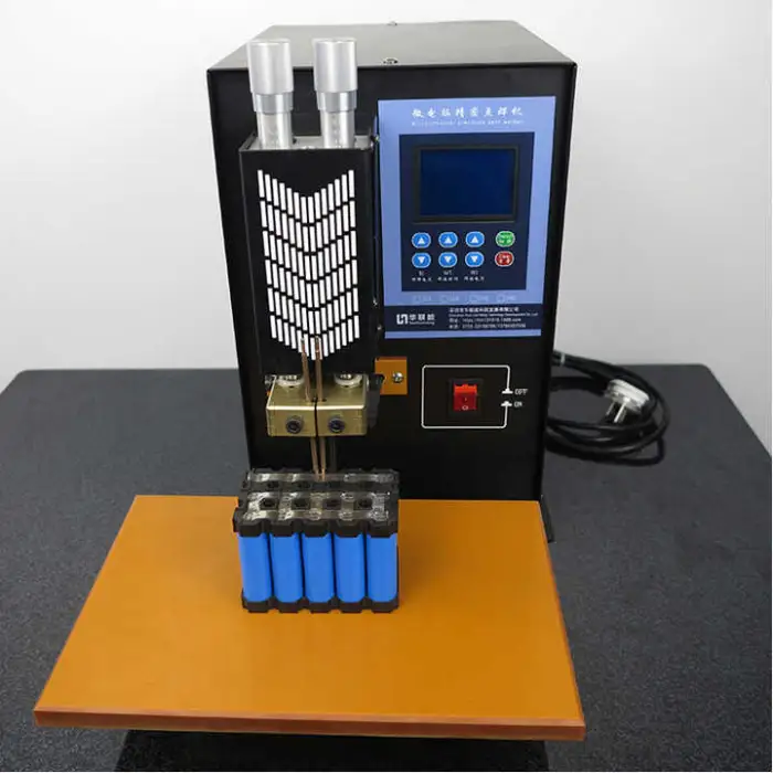 The machine is suitable for welding nickel-plated strips for various lithium-ion battery sizes, including 18650 and 32700 cells.