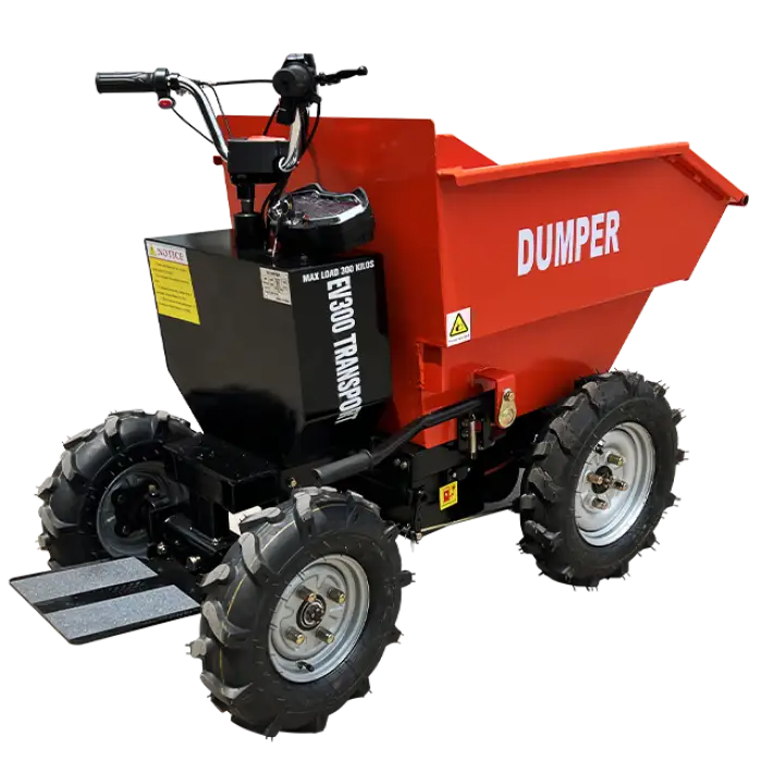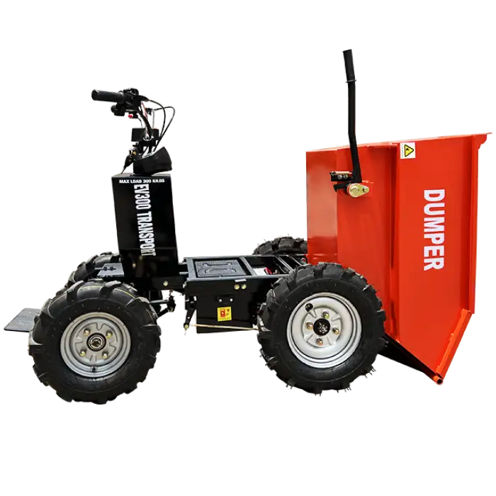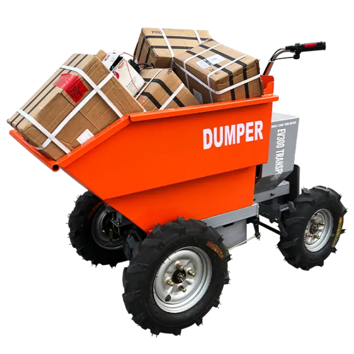 The efficient 4x4 wheel drive system allows this wheelbarrow to handle various terrains, including uneven surfaces commonly found in construction sites and gardens.