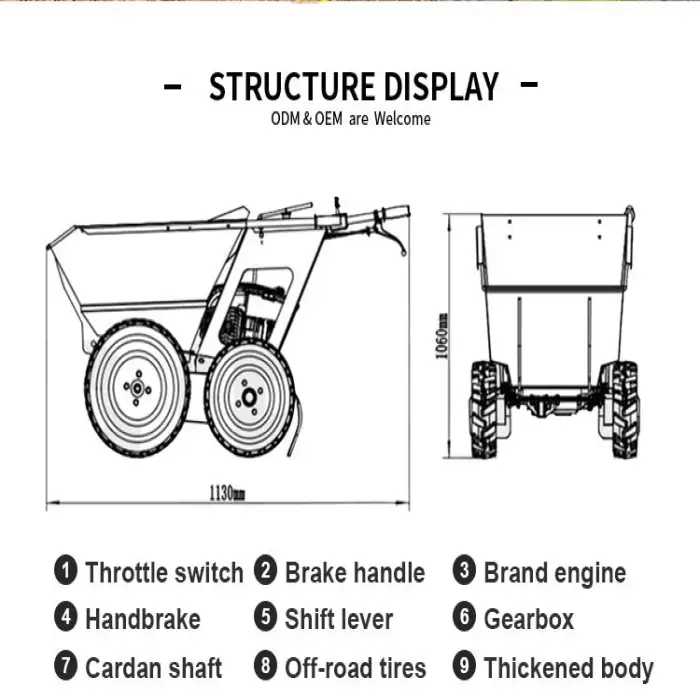 The gasoline engine provides reliable performance, ensuring that the wheelbarrow can handle heavy loads efficiently.