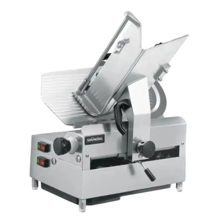 This model is fully automatic: place the product on the carriage and the machine will feed and slice automatically. Manual models are different—consult the product listing if you need a manual option.
