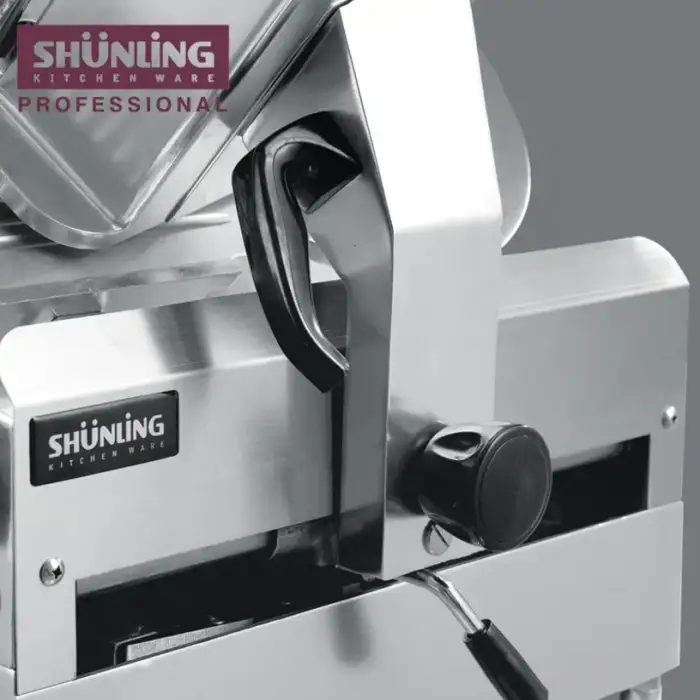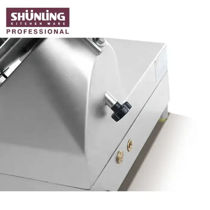 As a commercial electric slicer with a powerful motor, it will produce typical commercial kitchen noise levels. For exact decibel ratings, refer to the technical specifications or ask the supplier.