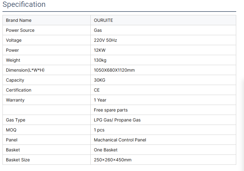 As a gas fryer, it does not consume electricity, but the gas consumption will depend on the type of gas used and the frying duration.