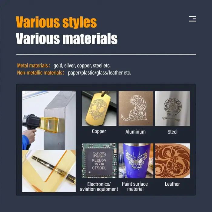 This 30W fiber laser is optimized for metals—including stainless steel, carbon steel, aluminum, brass, copper, titanium, and coated metals—and can mark some plastics and coated materials. Marking results (depth, contrast) vary by material and finish; performing a test on your specific substrate is recommended.