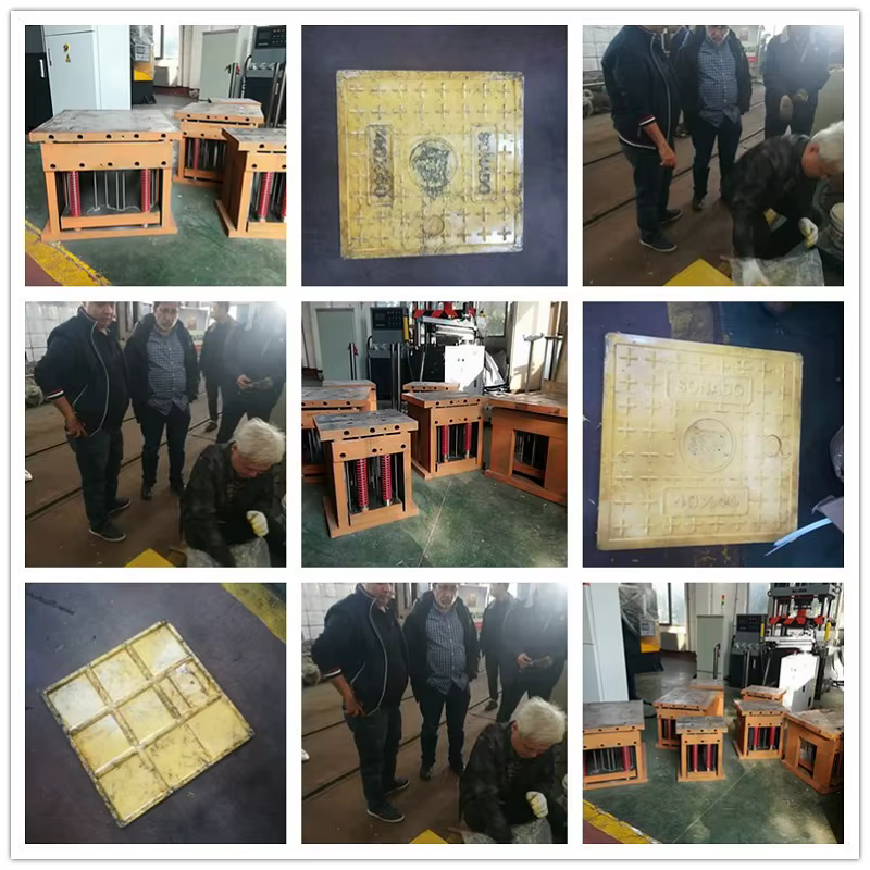 The machine is designed for manufacturing FRP manhole covers and producing durable and lightweight construction materials.