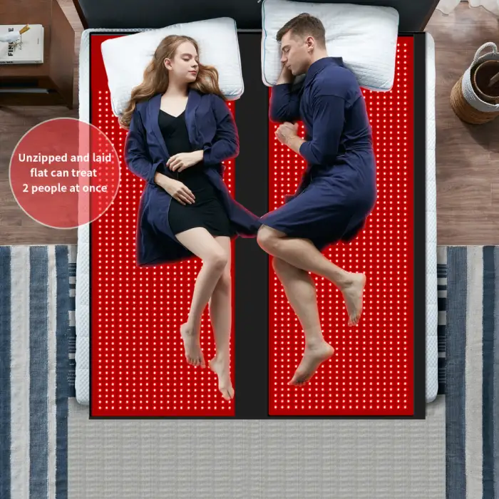 The sleeping bag is designed for red light therapy, promoting relaxation, muscle recovery, and overall wellness.