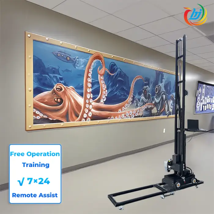 The machine can print on a variety of surfaces including walls, glass, wood, ceramic, and metal.