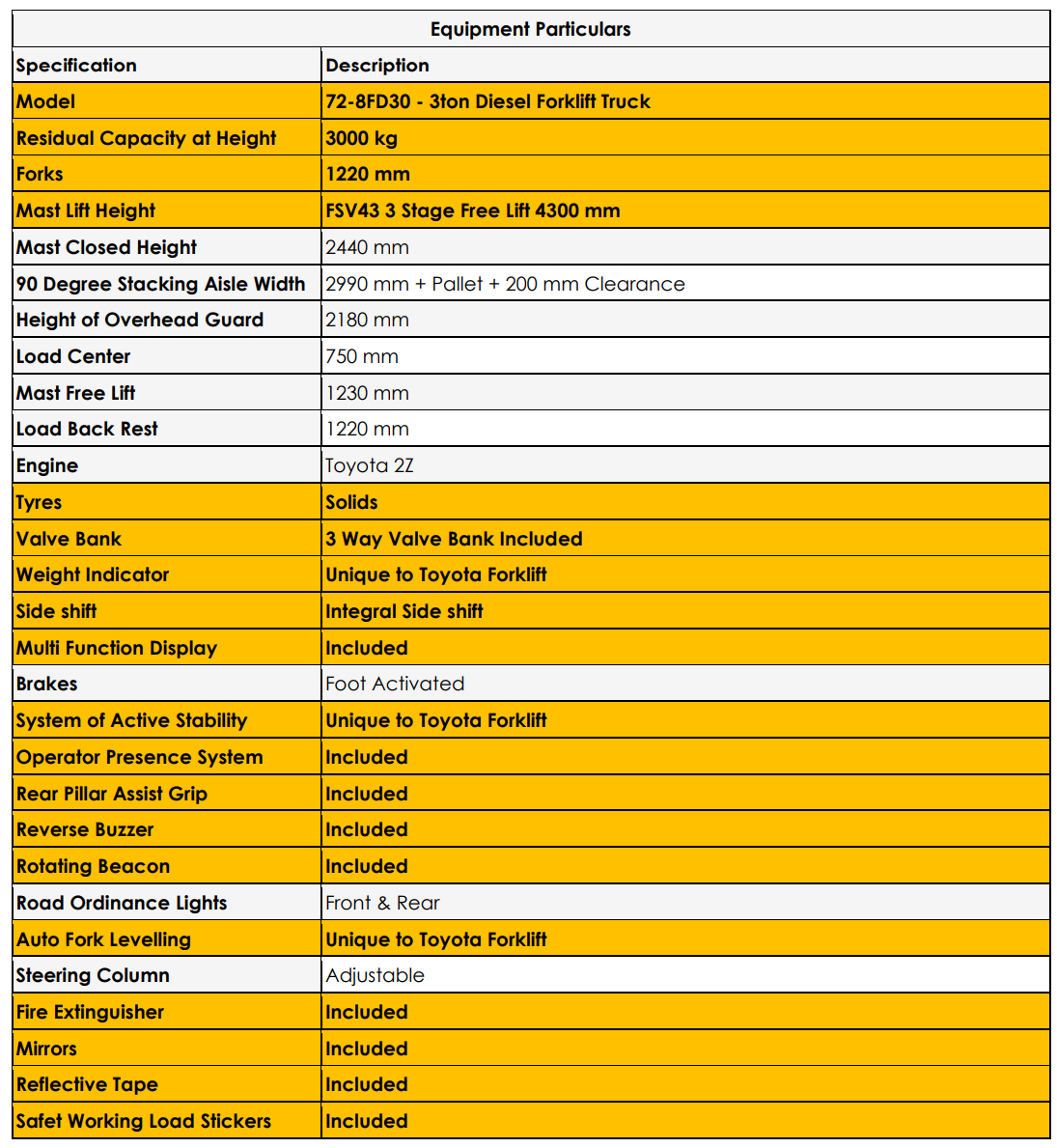 The 72-8FD30 forklift has a maximum lifting capacity of 3 tons.