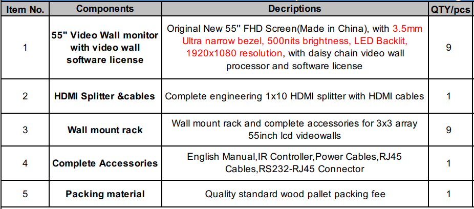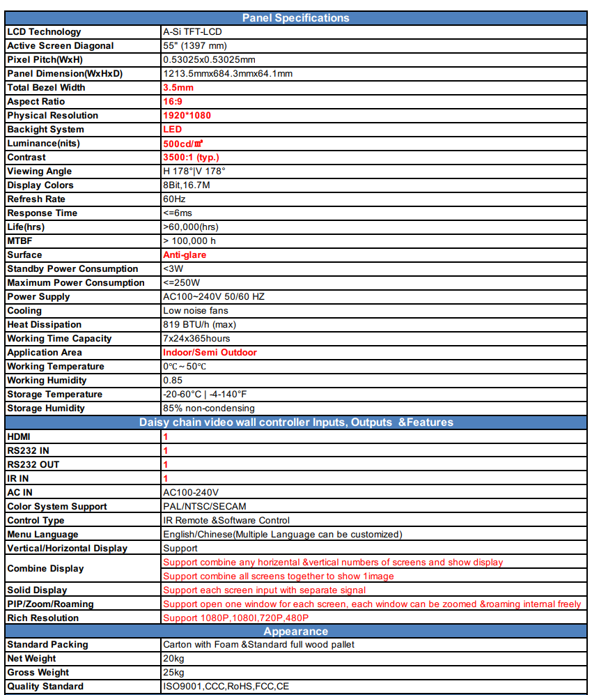 The 3x3 55" LCD Video Wall features a Full HD (FHD) resolution of 1920 x 1080 pixels.