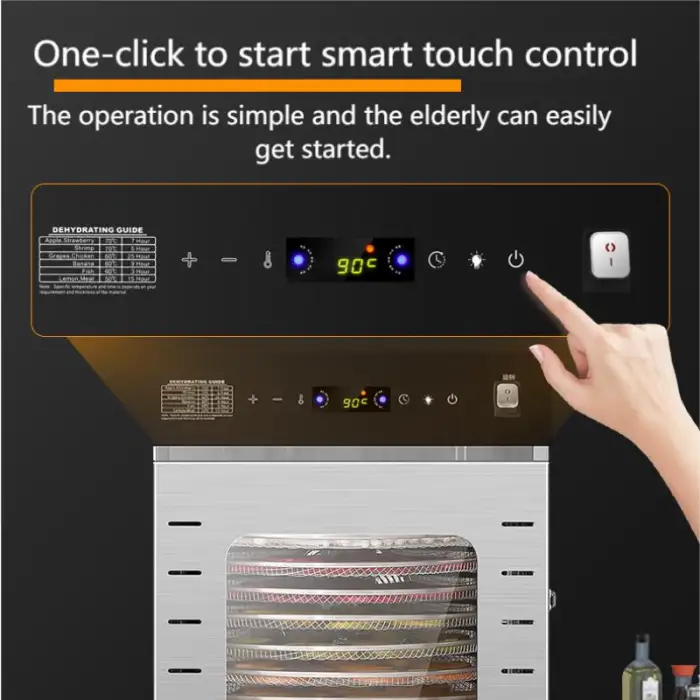 The dehydrator is constructed from high-quality stainless steel, ensuring durability and ease of cleaning.