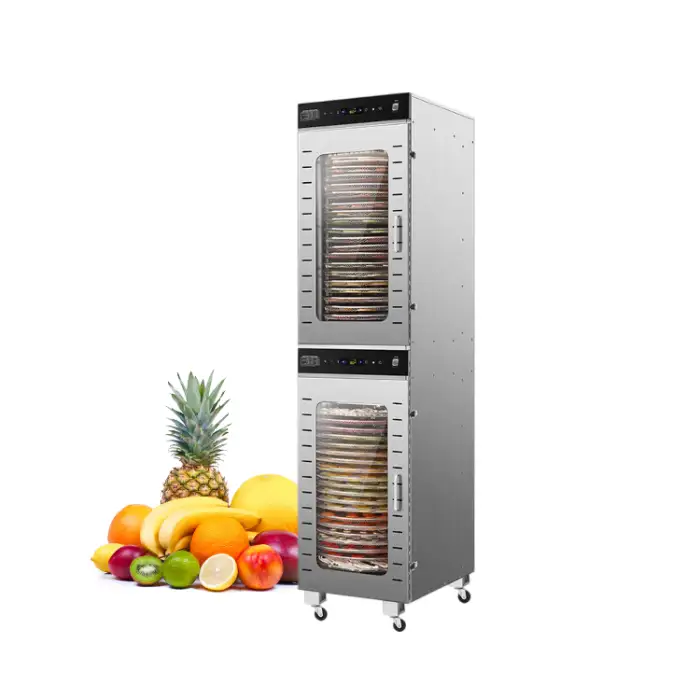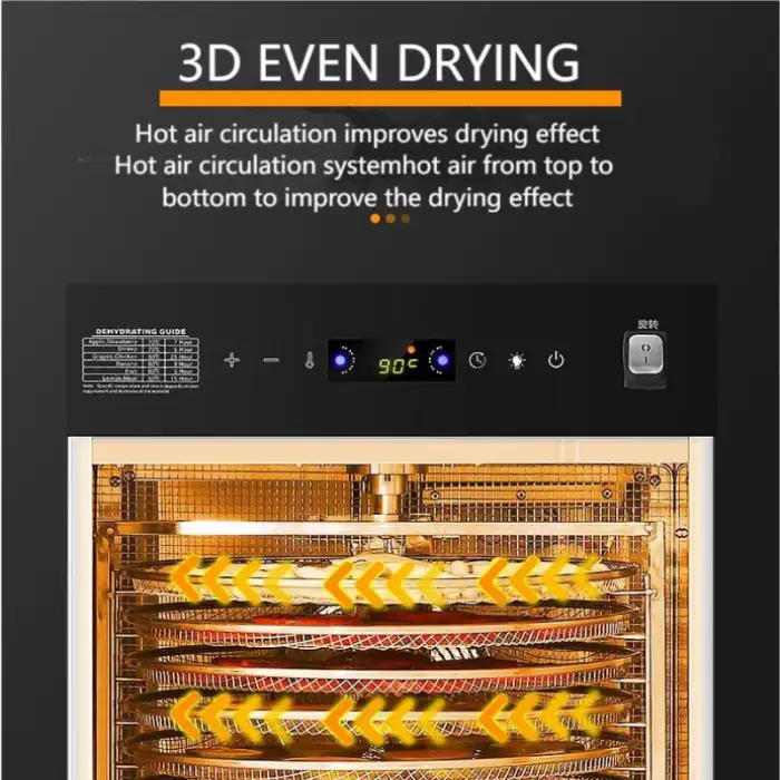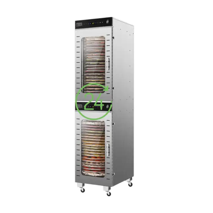 The machine features 40 rotating trays, allowing you to dry large quantities of fruits and vegetables simultaneously.