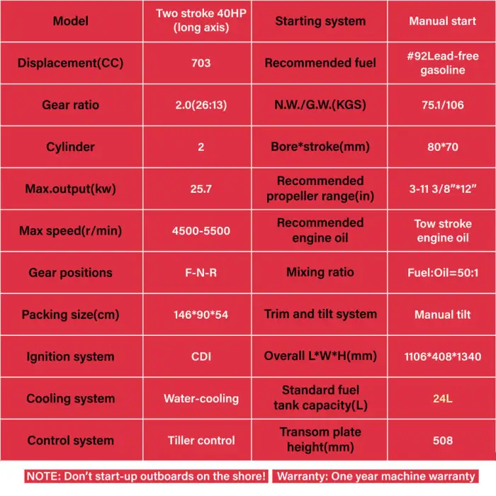 The 40H P 703cc outboard motor has a power output of 40 horsepower.