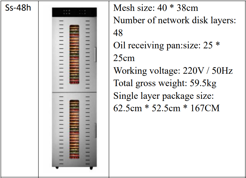 The 48 Tray Stainless Steel Fruit Dryer operates on 220V / 50Hz power for reliable performance.