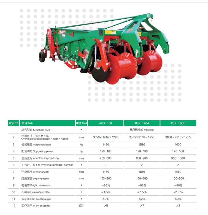 The 4UX-170A is a tractor-mounted attachment designed to lift and separate potatoes (and other root crops) from the soil, reducing manual labor and increasing harvesting speed and efficiency.