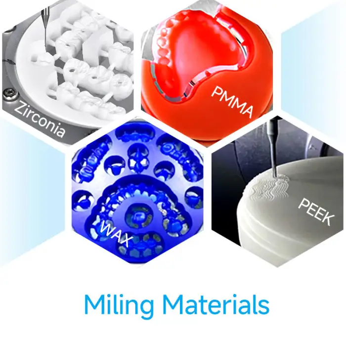 The machine is designed to work primarily with zirconia blocks, but it is compatible with various dental materials for creating precise restorations.