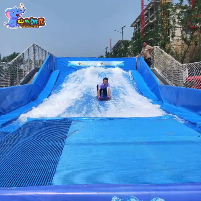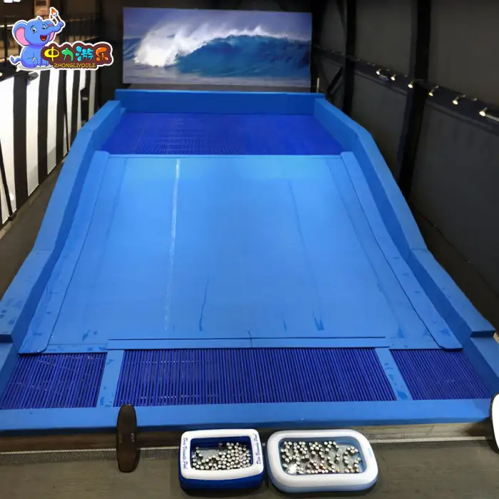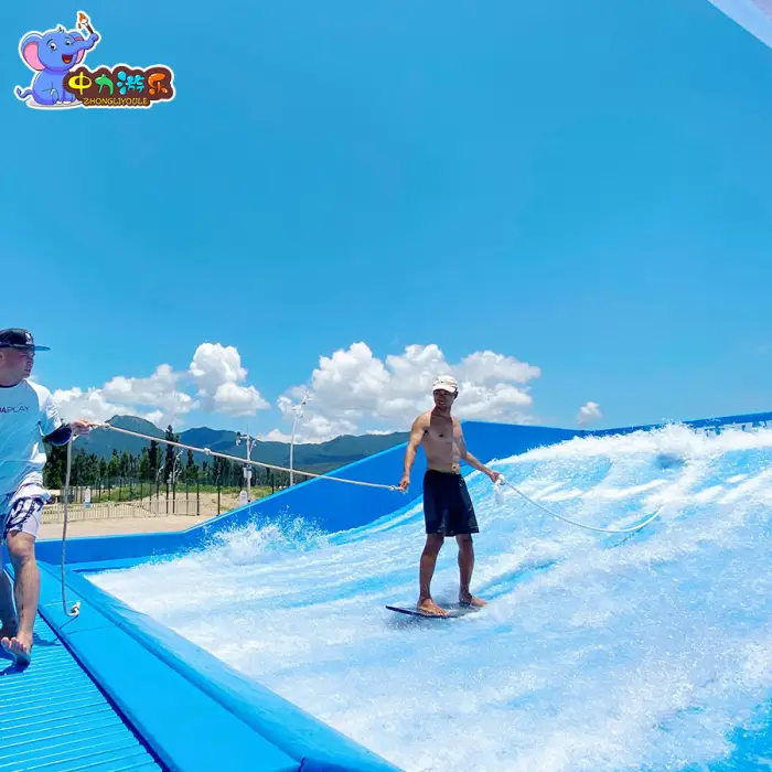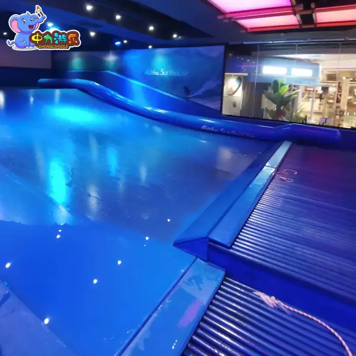 The simulator features adjustable water flow settings that allow users to customize the intensity of the surfing experience.