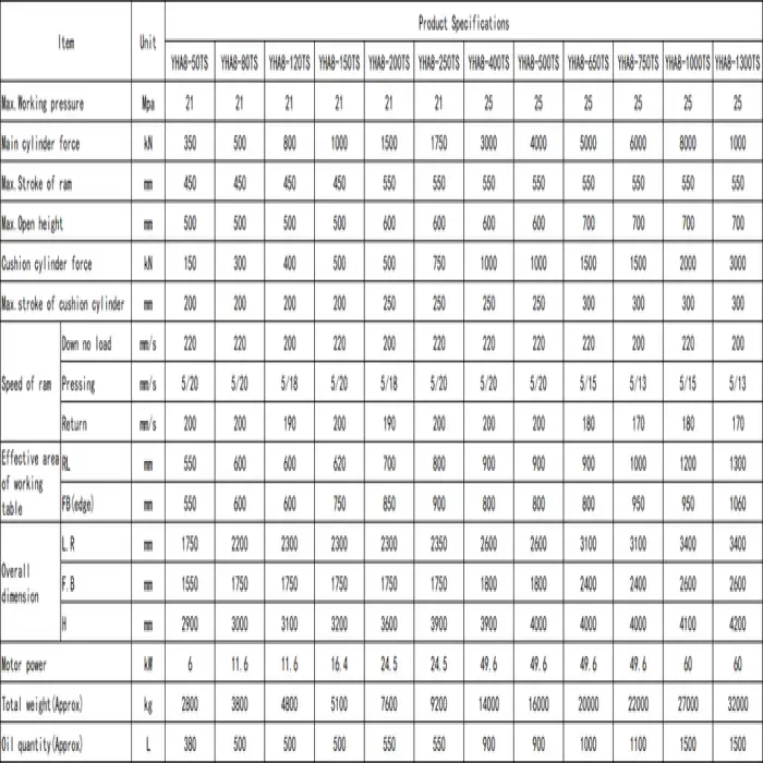 The hydraulic press offers slide stroke options of 450, 550, 600, 650, 750, and 850 mm.