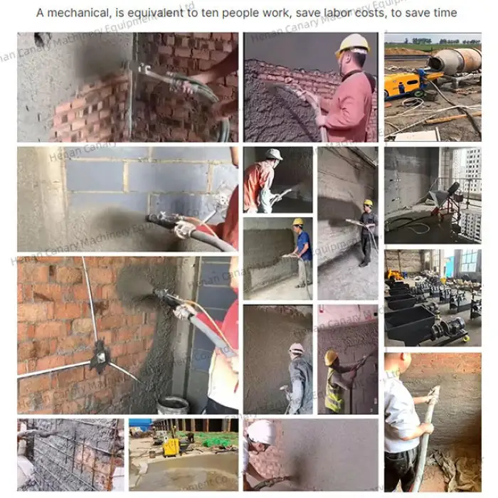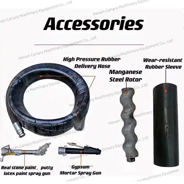The machine is suitable for spraying various materials including mortar, cement, and water.