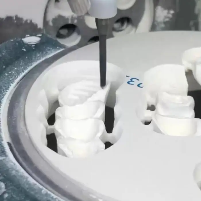 The machine can efficiently mill materials such as zirconia, PMMA, PEEK, and wax blocks.