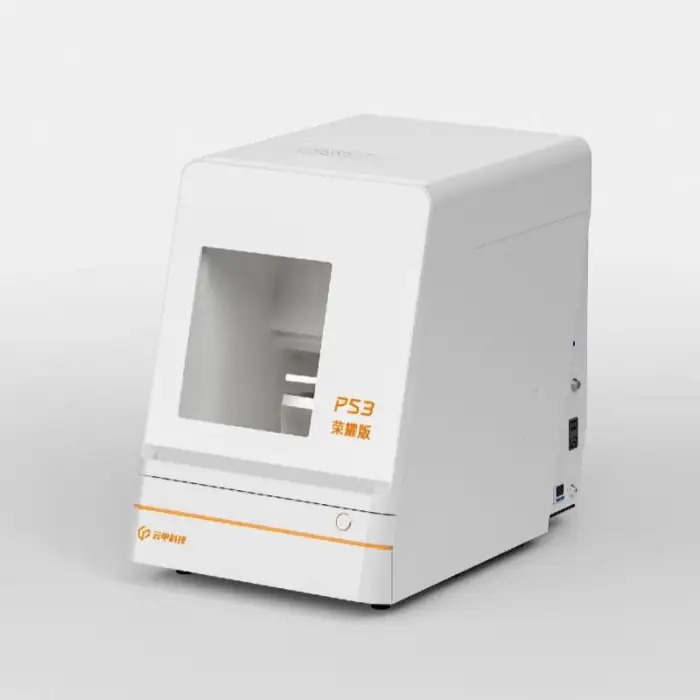 The dimensions of the 5-Axis Smart Dental Milling Machine P53 are 443.5 mm x 718 mm x 628.5 mm.