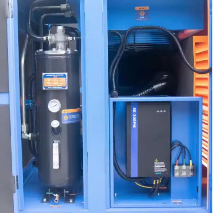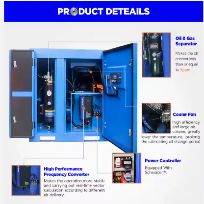 The core components include a PLC, pressure vessel, motor, and air end.